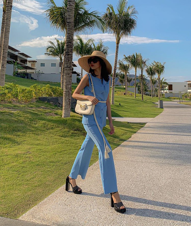 Giống Khánh Linh, Phí Phương Anh khoác lên mình nguyên cây xanh nước biển ngọt ngào. 9X có được vẻ đẹp của quý cô kiêu kỳ nhờ phối thêm phụ kiện là mũ rộng vành, túi Gucci và giày cao gót màu đen. Ảnh: @phi.phuonganh.